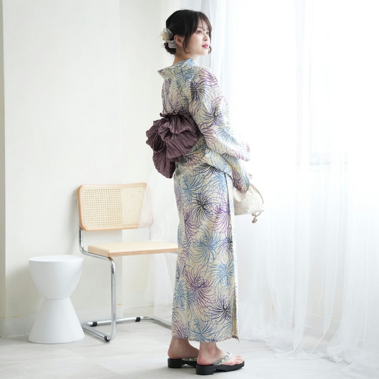 浴衣 セット レディース 浴衣 3点セット(浴衣/帯/下駄)Lサイズ 大きいサイズ トールサイズ 165cm〜175cm 菊 ベージュ系 紺 青 紫 ピンク 綿麻 麻混 特選 リネン 先染めベージュ 浴衣セット ゆかた 女性 レトロ